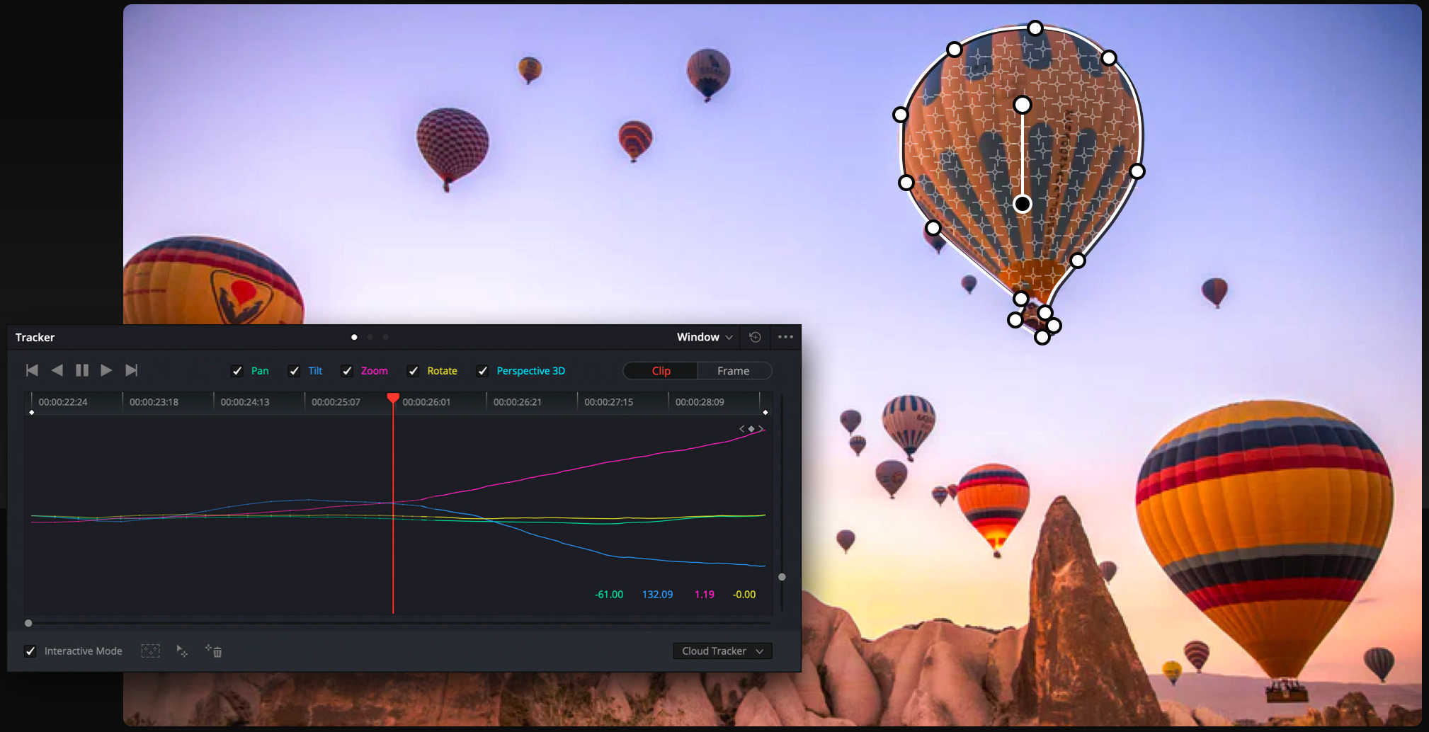 The tracker lets you automatically animate Power Windows to follow moving objects in a scene. To open the tracker palette, click on the cross hair icon in the toolbar. You’ll see a playhead, along with options for analyzing the pan, tilt, zoom, rotation, and 3D perspective of the shot. With your Power Window still selected, choose the options that best match the camera’s movement, move the playhead to the beginning of the clip, and click the track forward button. The clip is analyzed and the Power Window will be automatically animated to follow the object in your shot! The tracker can also be used to stabilize images or to attach effects, such as a lens flare, to specific objects in a scene.